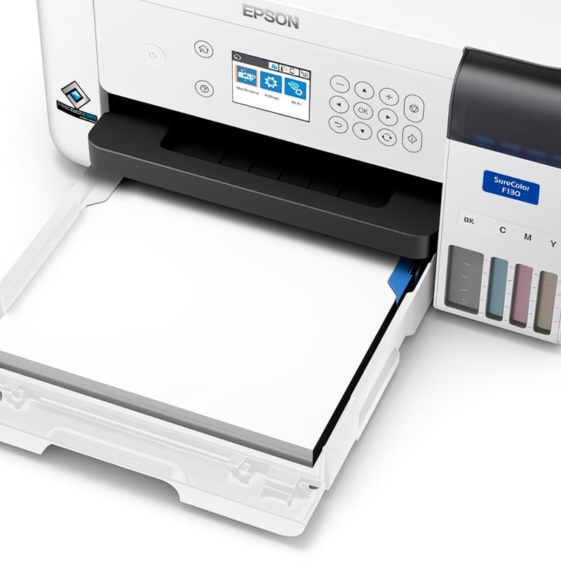 La Epson SureColor SC-F100 es una impresora de sublimación A4 con botellas de tinta de 140 ml, cabezal PrecisionCore MicroTFP y conectividad Wi-Fi, Wi-Fi Direct, Ethernet y USB 2.0.