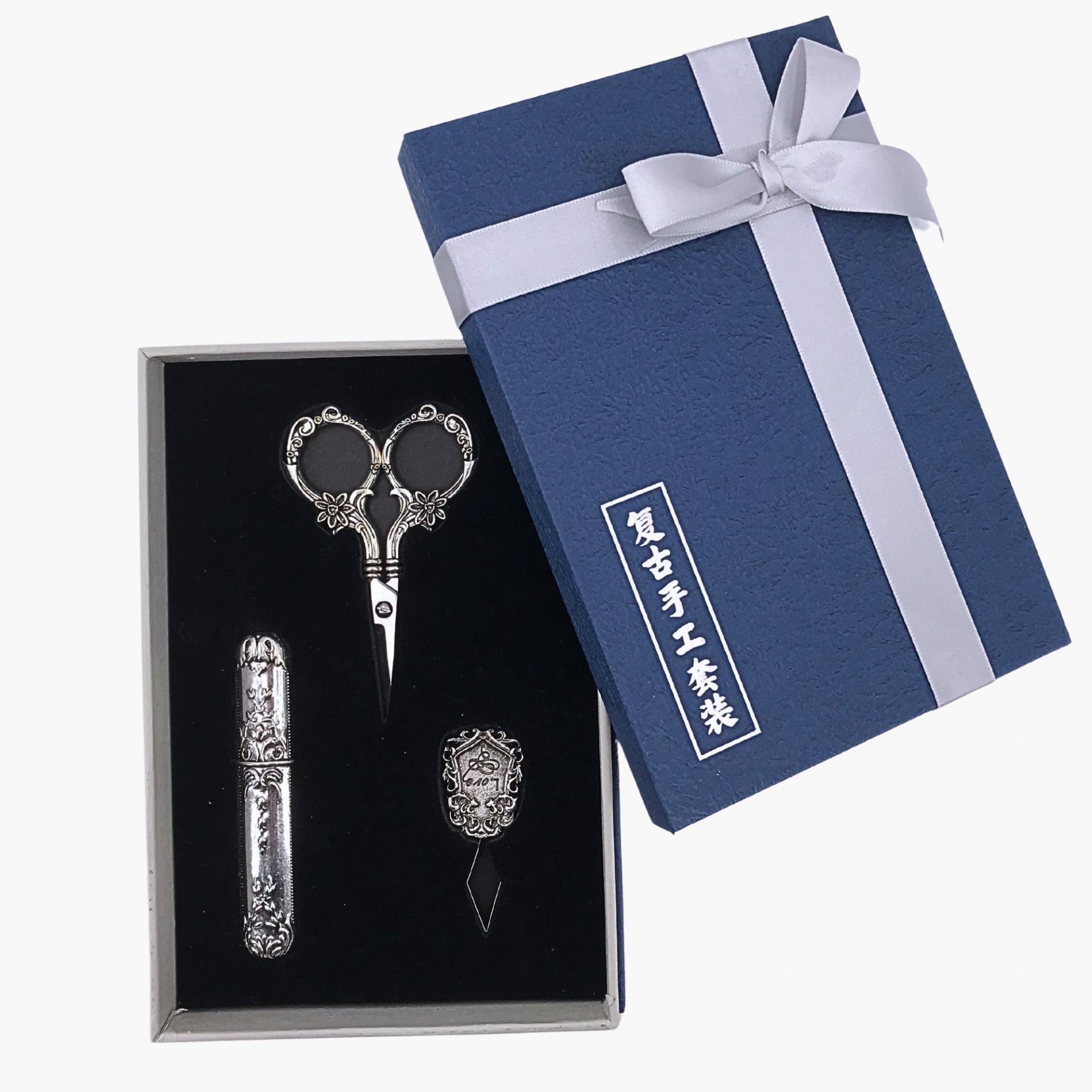 Set vintage de costura en caja regalo: tijeras de bordado estilo clásico, enhebrador y estuche portaagujas con relieve ornamental. Compacto, bonito y práctico para tener siempre a mano.